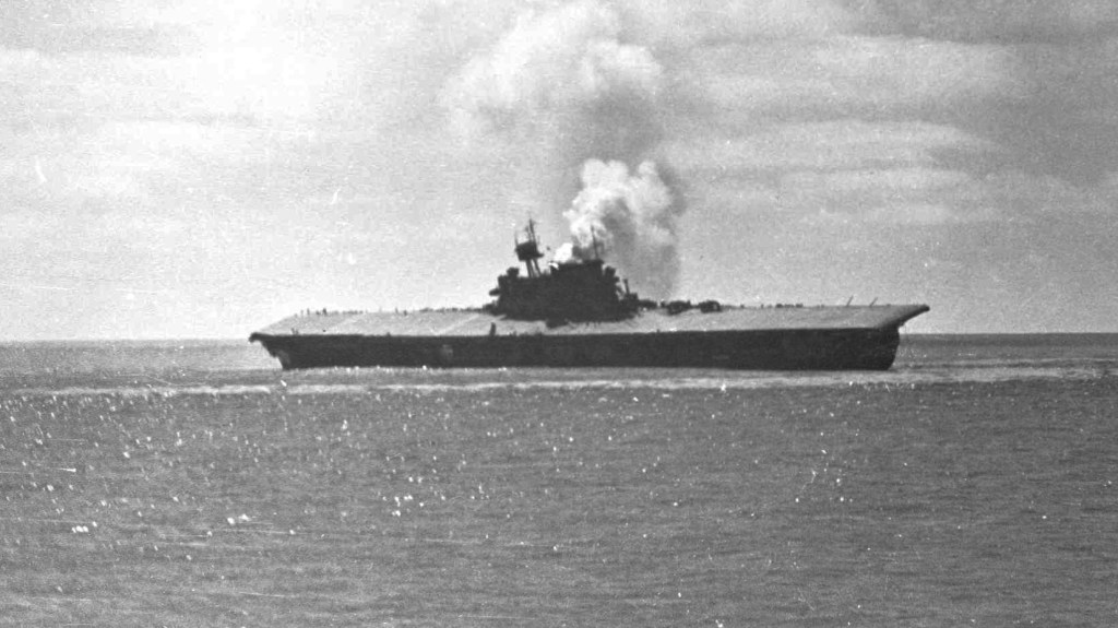 On the morning of June 7, 1942, the USS Yorktown, an American aircraft carrier, sunk beneath the waves in the Pacific Ocean. The previous day, June 6, the big carrier had been struck by multiple bombs and torpedoes from attacking Japanese planes and a submarine in the Battle of Midway. The Yorktown had been damaged in the Battle of the Coral Sea, but had returned to Pearl Harbor, repaired in 48 hours, and then returned to battle. In the ensuing fight, the ship was hit with several bombs, but the crew managed to keep the fires suppressed long enough to keep the big carrier moving. Eventually, however, she was hit by torpedoes and began to list heavily. The Captain, Elliot Buckmaster, ordered the ship abandoned before it turned over and sank the following morning.