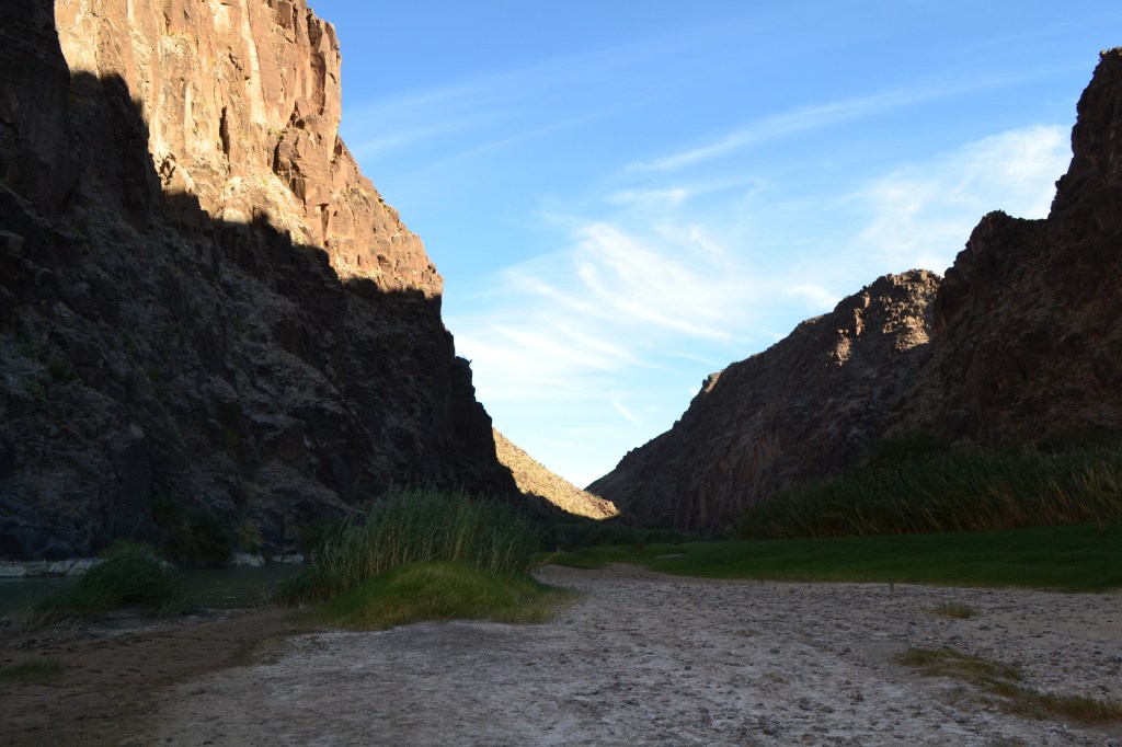 The other landmark we used was we drove through the park was the unmistakable cleft in the rocks where the Rio Grande comes out of the cliffs at Santa Elena Canyon. Because the Lost Mine Trail is fairly short, we finished by noon and set off for Santa Elena Canyon, visible in the distance. The entire park has roads that lead from one trailhead to the next and just driving these two lane black tops is a visual feast. We arrived and headed for the trail head at Santa Elena Canyon. People splashed in the shallow water where the Rio Grande river exits the sheer canyon walls. We headed up a flight of steps and walked along the path that follows the US side of the canyon in for about a half mile. For our efforts, we were rewarded with the echoes of walking in a deep canyon and stepped through and around the dense river cane that grows along the banks of the Rio Grande. The sound of the gentle river mixes with the wind in the river cane to make a peaceful rustling. We walked in shadow since the canyon walls block out direct sunlight for all but a few minutes each day. Just looking at the tiny river and the deep gorge it has created teaches in a way no words possibly could the power of geological time. Water carves, and rock gives way.